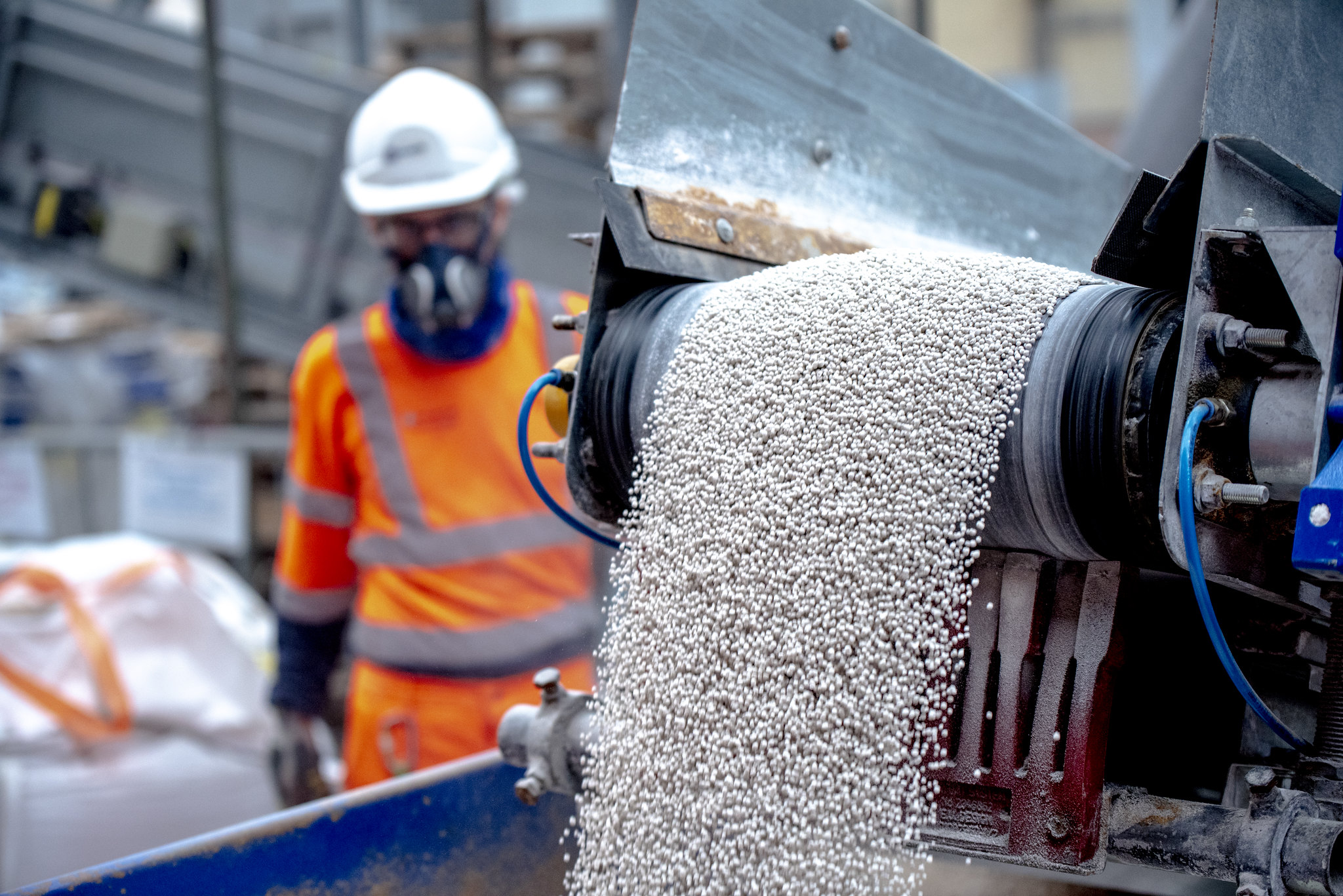 聚氯化钾肥料在英国北约克郡Woodsmith项目加工后被装入袋子。