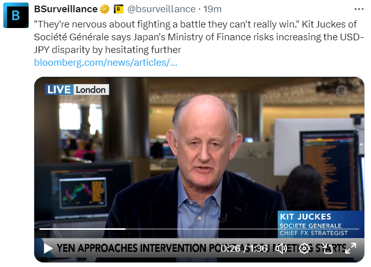 我们一直在看日元冲破一个又一个所谓的红线。最新的应该是每美元155日元,然后这个数字被打破了。外汇老手Societe Generale的基特·朱克斯认为170是可能的。虽然不是基本情况,但是,是的,这可能会发生。