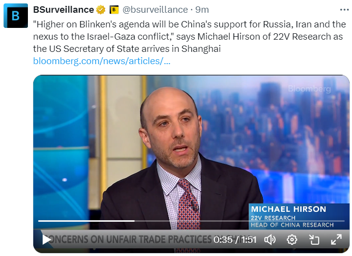 22V研究公司的迈克尔·赫森表示:“布林肯的议程中更重要的将是中国支持俄罗斯、伊朗以及以色列-加沙冲突的关联,然后是南中国海。随着中国和菲律宾之间的紧张关系,这可能会很容易地牵扯美国,因为美国与菲律宾是条约盟友。”