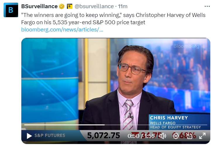 根据越来越多的监控节目的嘉宾说,即使2024年剩下的时间利率保持不变,股市仍然可以继续上涨。最新说出这番话的是富国证券的Chris Harvey,他对标普500指数的目标为5,535点,是彭博汇编的26个估计中最高的。他表示,利率最终会下降,与此同时,有很多有利因素。