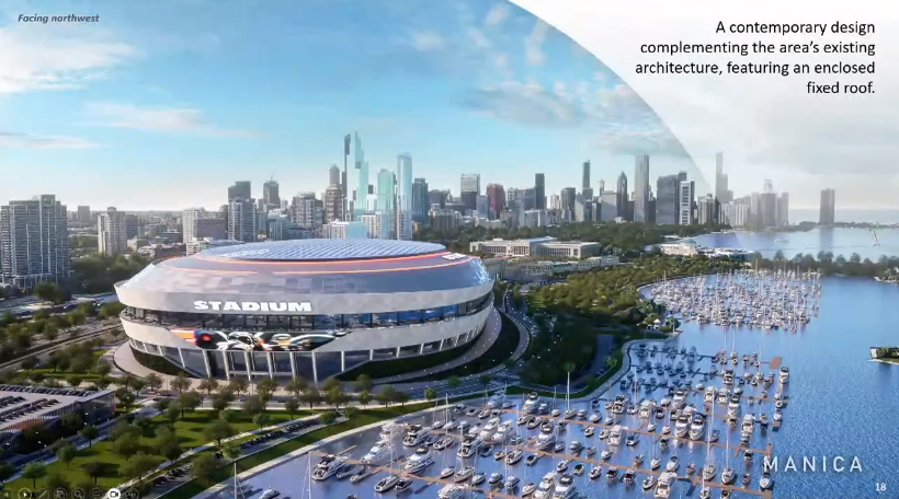 芝加哥熊队官员与市长布兰登·约翰逊一起公布了一项价值47亿美元的项目计划,建设一座公共拥有的封闭式体育场和增强的湖滨区域。
