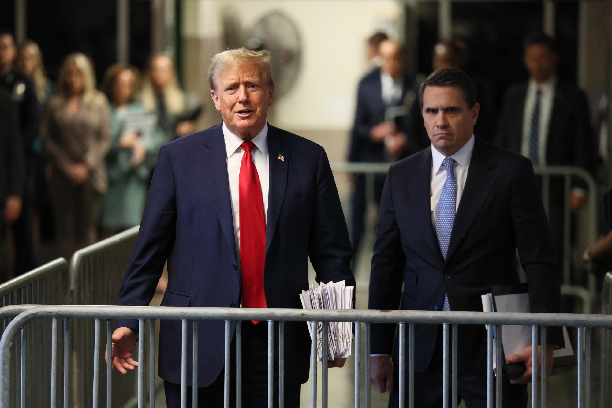 然后,他前往市中心的法院参加他的刑事审判的第八天,涉及向一名色情演员支付封口费。他可能会因违反法官的禁言令而对涉案证人进行贬低而被罚款或受到其他警告。