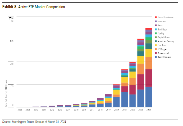 这项研究对那些看着数十亿美元从主动管理的共同基金中流失,转而青睐成本更低、税收更有效的ETF封套的基金经理们提出了警告。这种动态已经引发了一场竞争激烈的竞赛,发行商们争相抢占迅速增长的蛋糕份额,推动了创纪录的基金推出。但尽管主动管理的ETF以牺牲其共同基金同行为代价,实现了创纪录的资金流入,但晨星表示,主动ETF行业的领导地位非常集中,成功并不是必然的。