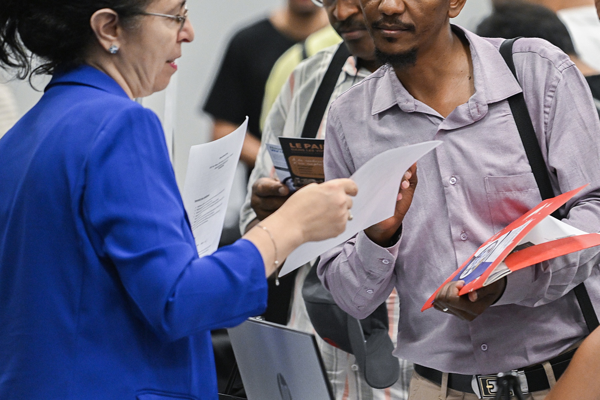 求职者在蒙特利尔的招聘会上与招聘人员交谈。