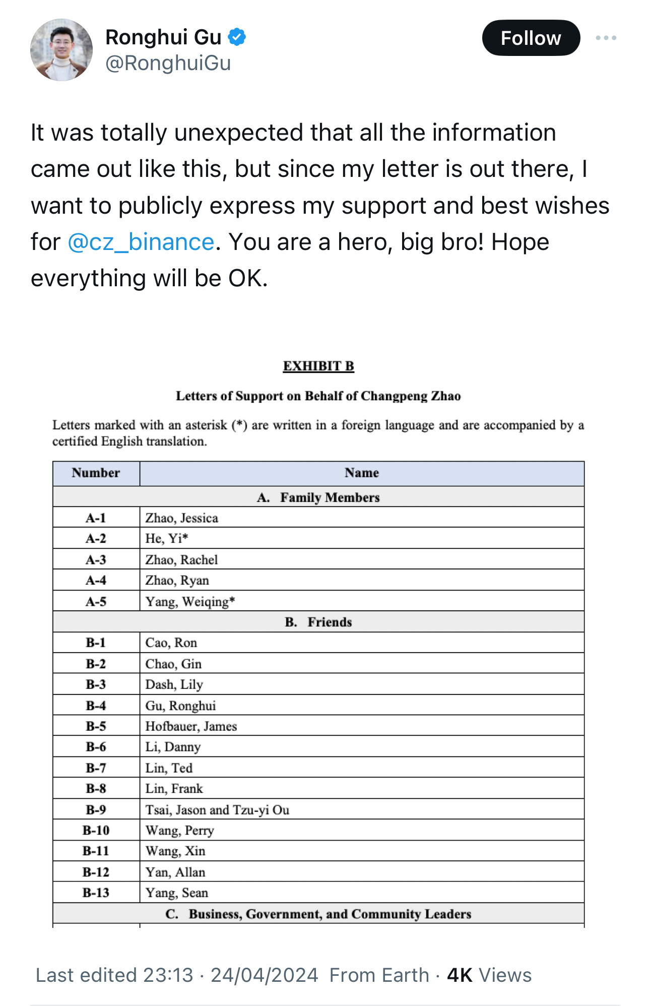 *顾荣辉,CertiK联合创始人,哥伦比亚大学副教授,表示他不知道自己的信件会被发表。来源:@RonghuiGu*作者中包括一些币安的高管。提交信件的现任高管包括币安主席Gabriel Abed,首席技术官Rohit Wad,总法律顾问Eleanor Hughes以及币安在土耳其、泰国和法国的运营经理。值得注意的是,赵长鹏的继任者Richard Teng以及首席合规官Noah Perlman都没有出现,后者负责确保公司过去的罪行不再出现。
