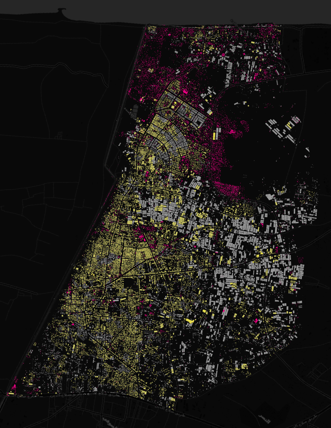 我们还将我们的帐篷分析与俄勒冈州立大学和CUNY研究中心的研究人员创建的建筑损坏分析相结合,以展示在拉法发生了多少变化。以下是这两个模型的早期、未发表的输出示例。粉色代表帐篷,黄色代表受损建筑,灰色代表在战争开始前存在的建筑。