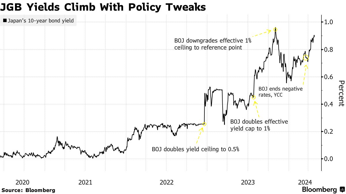 Gupta认为,日本的紧缩周期可能延续到2025年,他是一名管理超过400亿美元资产的Pimco基金组合经理,对日本债券持有轻仓。在备受期待的日本银行政策决定公布前一天,日元接近34年低点,债券收益率逼近1%,交易员们正在等待上田和夫行长的政策暗示以确定市场走向。