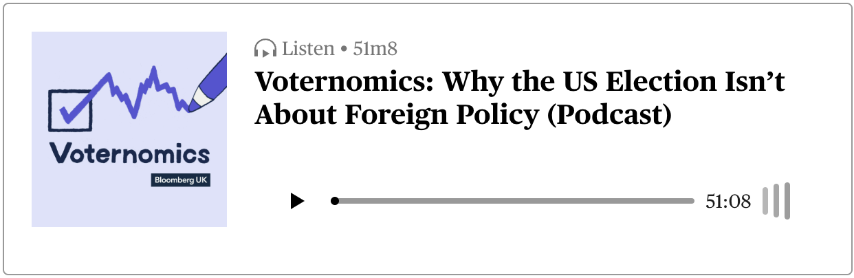 编辑注*:别错过彭博的新播客系列*Voternomics。由斯蒂芬妮·弗兰德斯、阿莱格拉·斯特拉顿和阿德里安·伍德里奇主持,Voternomics将解读世界各地选举,尤其是美国和英国选举对经济、货币和市场的影响。本周,与历史学家兼作家奈尔·弗格森讨论为何美国选举不是关于外交政策。