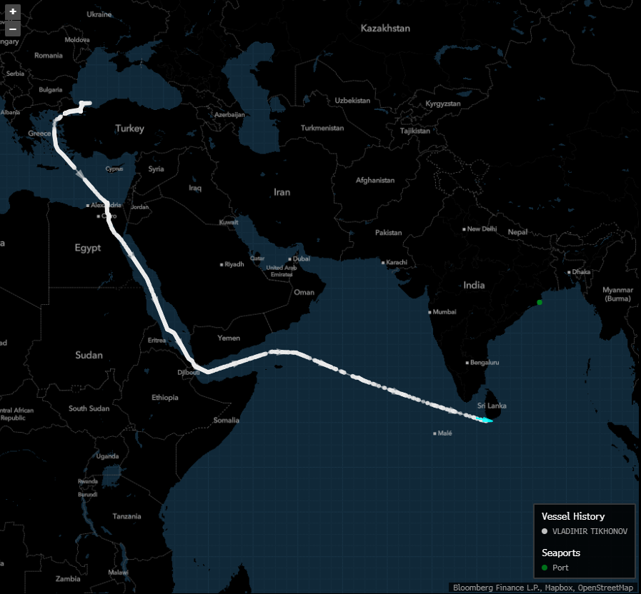 油轮弗拉基米尔·提霍诺夫正在向巴拉迪普发出信号,这是在短暂停顿后首艘驶往印度的船只。来源:彭博在莫斯科入侵乌克兰后,印度成为俄罗斯原油的重要出口市场,但上个月所有印度的炼油商都表示他们将停止接收由Sovcomflot油轮运载的原油,因为美国实施了制裁。如果弗拉基米尔·提霍诺夫成功靠岸并卸货,这将表明印度加工企业的立场发生了变化。这也将是普京总统在寻求资助对抗基辅战争时的一次胜利。