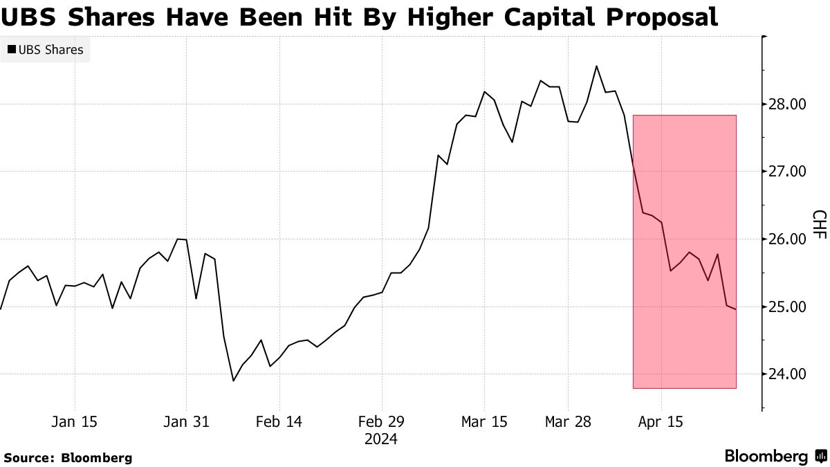 本月早些时候,瑞士政府公布了监管提案,可能导致瑞士联合银行面临约200亿美元的额外资本要求,彭博社报道。这些规定旨在在去年瑞士信贷银行倒闭后将其推向系统性危机边缘后,使该国银行业更加安全。