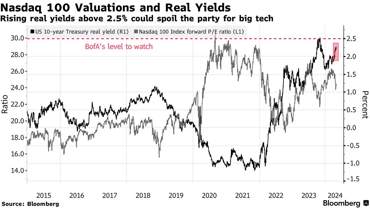 这种集中度将保持不变,直到实际10年期收益率(根据实际资金成本调整的利率)上升到约3%,“或者更高的收益率与更高的信贷利差结合起来威胁到衰退”,策略师们在一份备忘录中写道。通胀调整后的高债券收益率,被视为紧缩金融条件的代理,是股市泡沫破裂的常见方式。