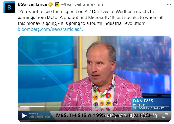 艾夫斯,Wedbush证券的坚定看涨者,今天与谷歌母公司Alphabet Inc.和微软公司一起享受了一个“我早就说过”的时刻。在大幅超出预期的收益后,两者都在上升。还有什么比三次NFL冠军四分卫帕特里克·马霍姆斯更好的类比呢?
