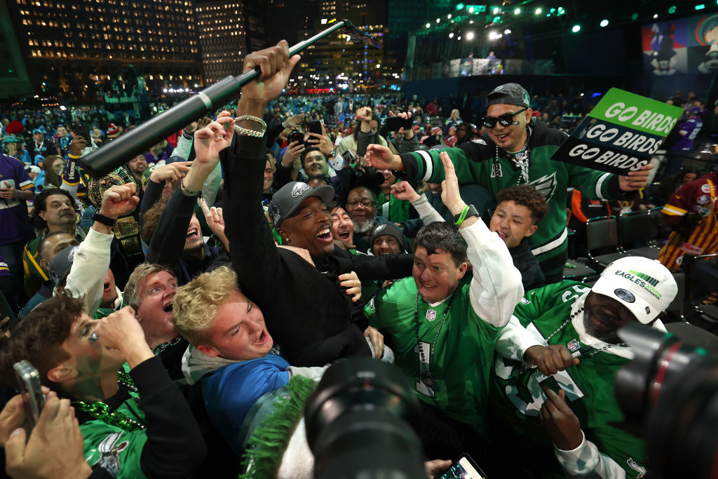 Quinyon Mitchell在2024年NFL选秀的第一轮中被费城老鹰队选中后,与球迷一起庆祝。摄影师:Gregory Shamus/Getty Images North America但在过去的两年里,底特律橄榄球终于扭转了局面。密歇根狼队赢得了大学橄榄球全国冠军,底特律狮队距超级碗仅差一场比赛。