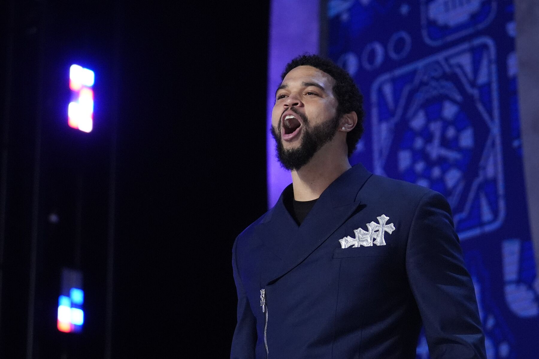 南加州四分卫卡勒布·威廉姆斯(Caleb Williams)在2024年4月25日星期四底特律举行的NFL足球选秀第一轮前走上舞台。美联社照片/Jeff Roberson AP美联社