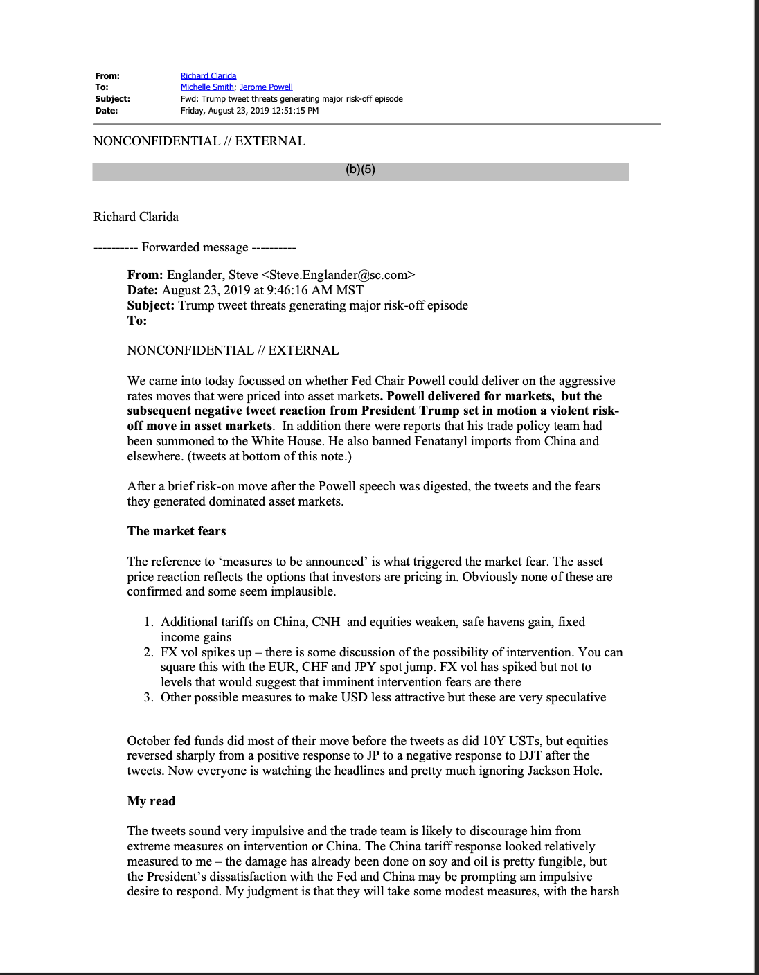 点击这里查看文件(第1页)美联储副主席理查德·克拉里达将标准银行全球研究与首席策略师史蒂文·英格兰德的一封电子邮件转发给了鲍威尔和联邦储备委员会的传播主任米歇尔·史密斯。该电子邮件称特朗普的帖子听起来“非常冲动,贸易团队可能会劝阻他采取干预或对中国采取极端措施。”