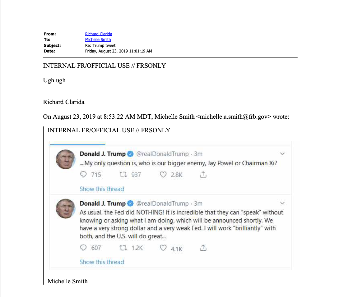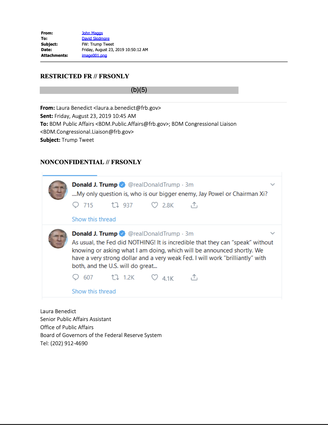 回到2019年,我向美联储提出了一份记录请求,因为我很好奇官员们对总统的Twitter声明做出了怎样的反应,以及这是否对经济产生了影响。我得到了14页的电子邮件。