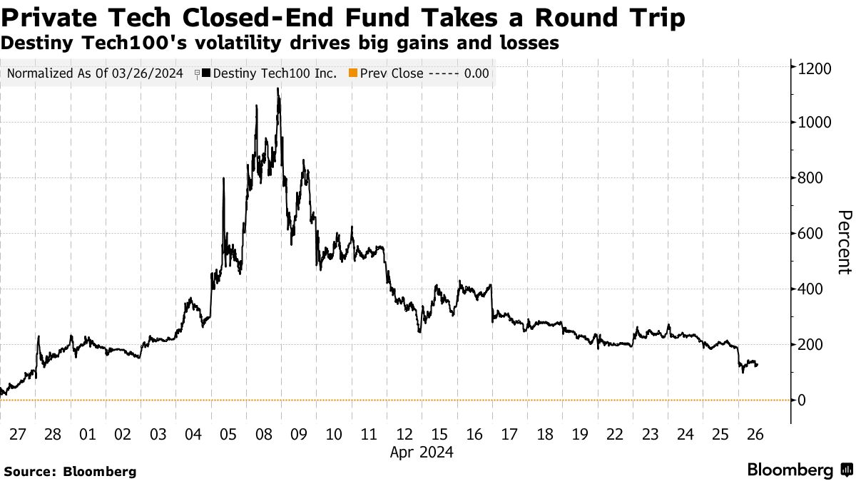 Destiny Tech100 Inc.,在纽约证券交易所以DXYZ交易,周五暴跌了多达32%,使得从高点开始的损失超过80%,因为这只波动性基金正朝着其持有公司的价值回归。该基金交易价为19.10美元,仍然价值大约是其投资公司的净资产价值的四倍,这些公司在2023年底为4.84美元。