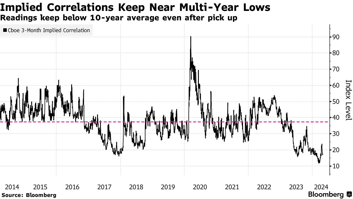 交易员普遍认为,股票将不再同步走动,带来选择赢家和输家的机会。尽管最近几个月50家最大标普500公司之间的隐含相关性指标有所上升,但这一反弹是从历史低位开始的。
