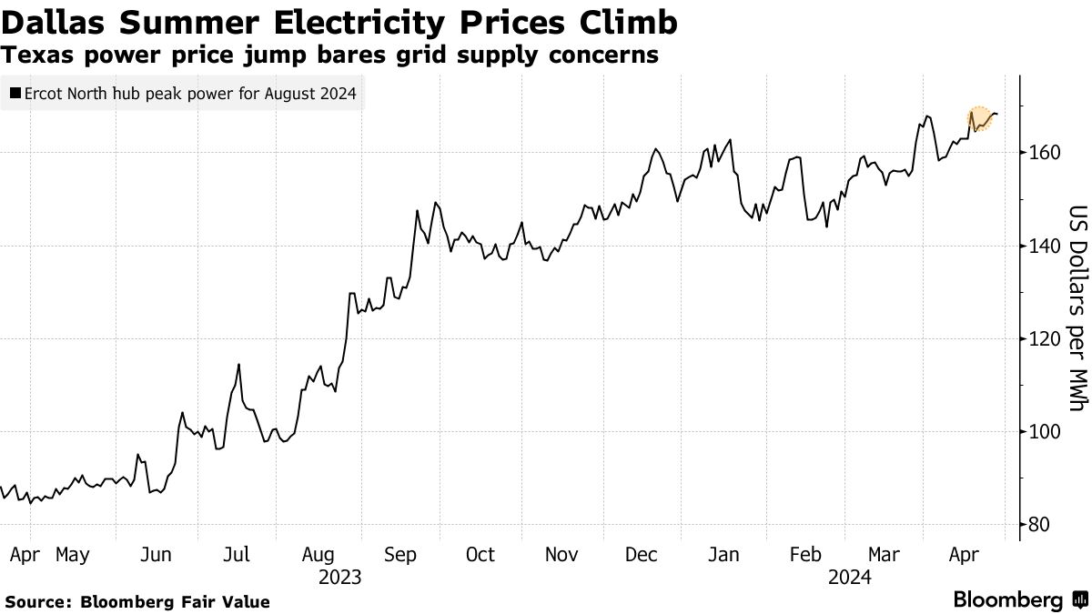 已经在4月中旬,达拉斯8月份的电力价格飙升至每兆瓦时168.70美元,这是五年来同期最高水平,根据彭博公平价值数据。价格仍在这个水平附近徘徊,较去年同期提高了82%。