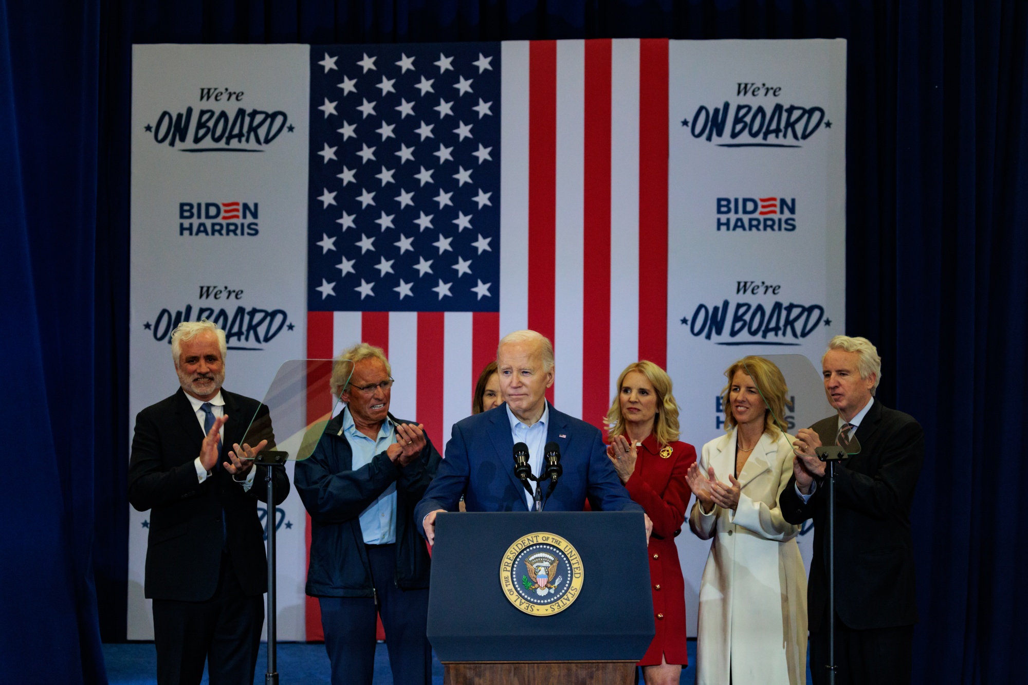 美国总统乔·拜登在费城与肯尼迪家族成员举行的竞选活动中讲话,时间为4月18日。摄影师:汉娜·贝尔/彭博社