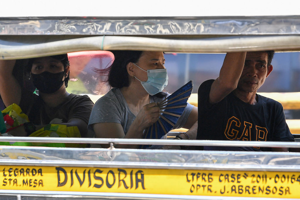 一名女子在马尼拉的一辆乘客吉普内降温。