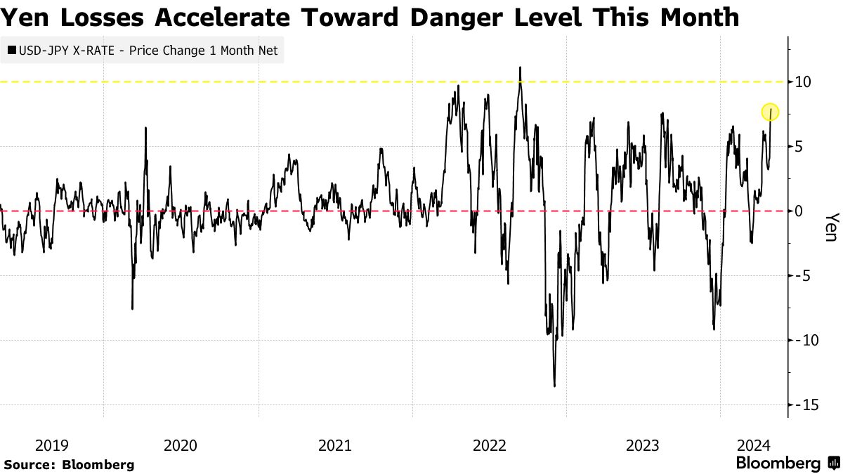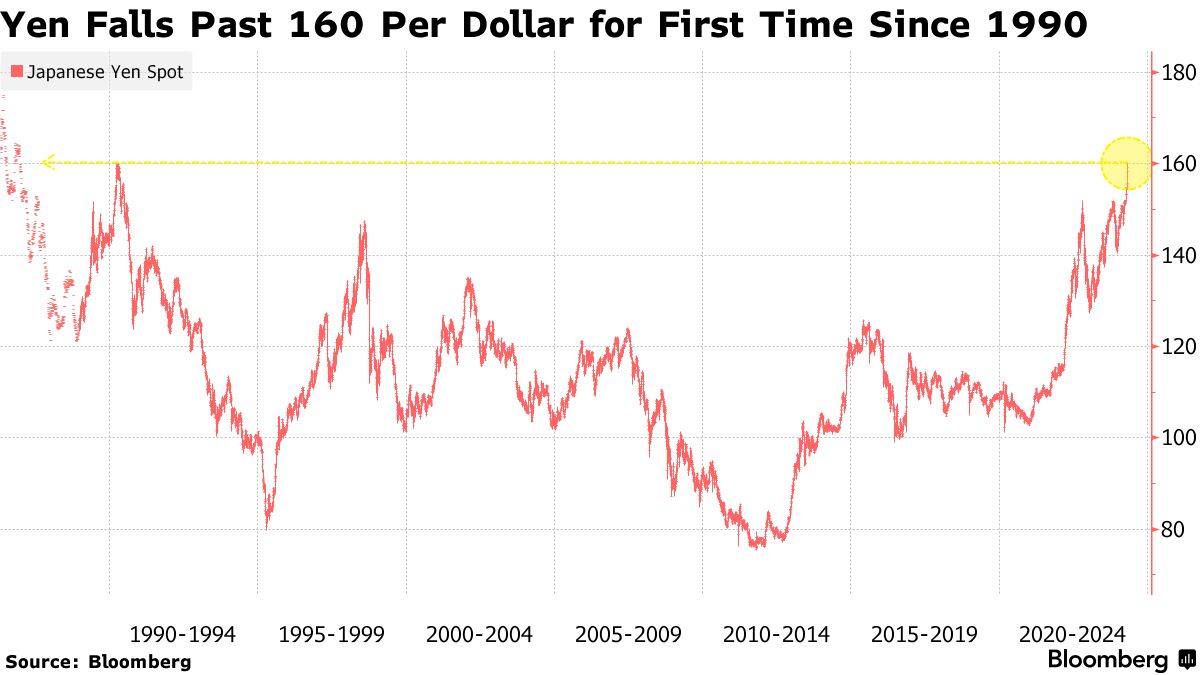 JPY/USD:日本弱势日元首次自1990年以来跌破每美元160日元 - 彭博社