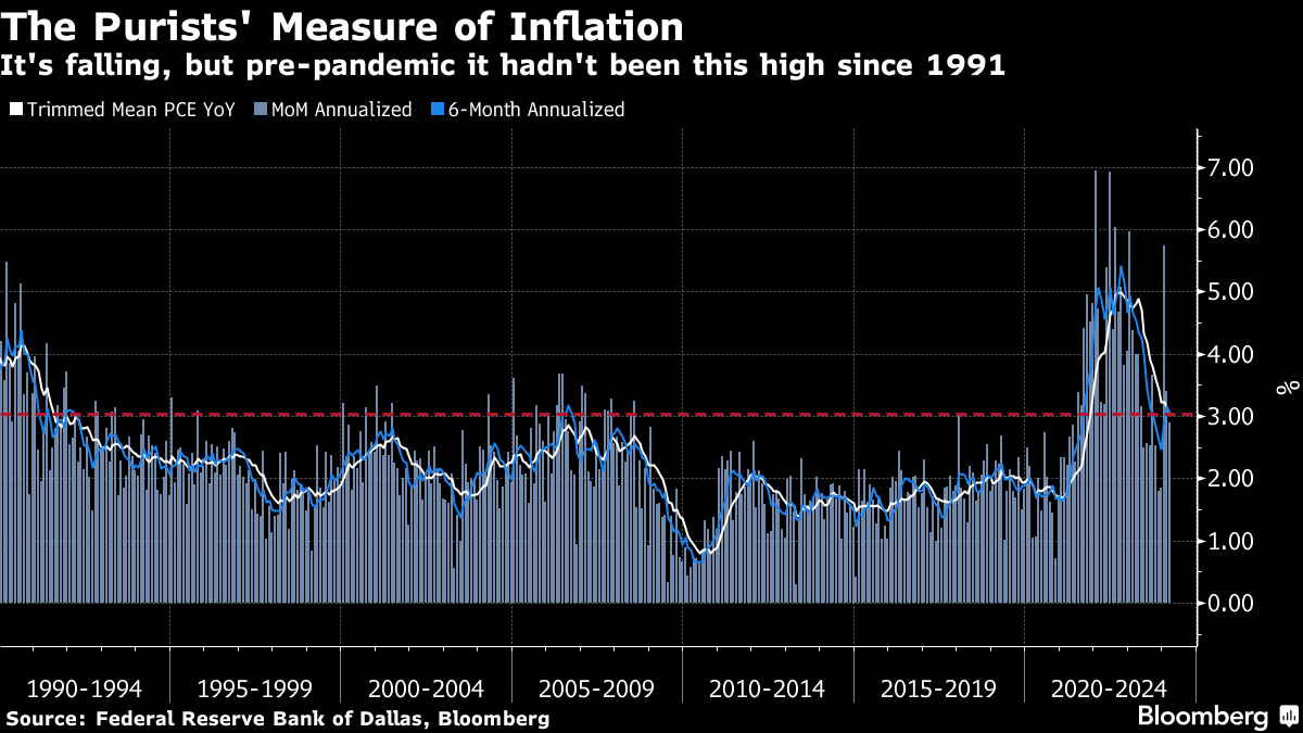 听起来很糟糕。但情况可能会更糟。达拉斯联储制作了个人消费支出的“修剪均值”数据,剔除了主要的异常值并对其余值进行平均。这项练习的好消息是,它正在减少——仍略高于3%,这暂时排除了降息,但表明通货紧缩仍在继续,尽管速度较慢: