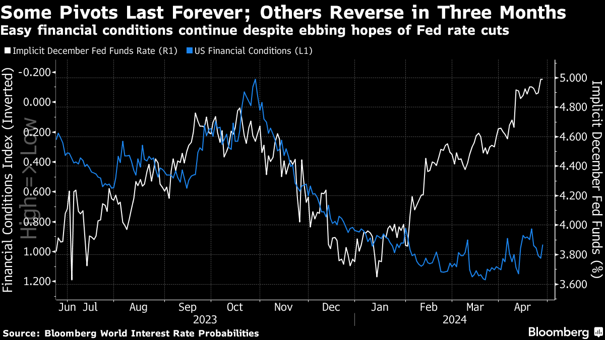 市场如何对略显失望的消息做出反应?通过发起一场反弹。数据并没有严重偏差,焦虑的传言曾暗示可能会高得多。这对风险资产是有利的。这种乐观情绪也意味着金融状况保持适度,股市离历史最高点不远,信贷市场也强劲。这导致了当下最奇怪的现象之一。上次市场让自己相信利率会“长期保持较高”时,即去年十月,更广泛的金融状况明显收紧。这正是预期的结果。保持较高利率的整个目的是收紧条件,稍微减缓经济增长速度。现在,从联邦基金期货中彭博社测得的市场预期对降息的看法要悲观得多,但这并没有改变金融状况: