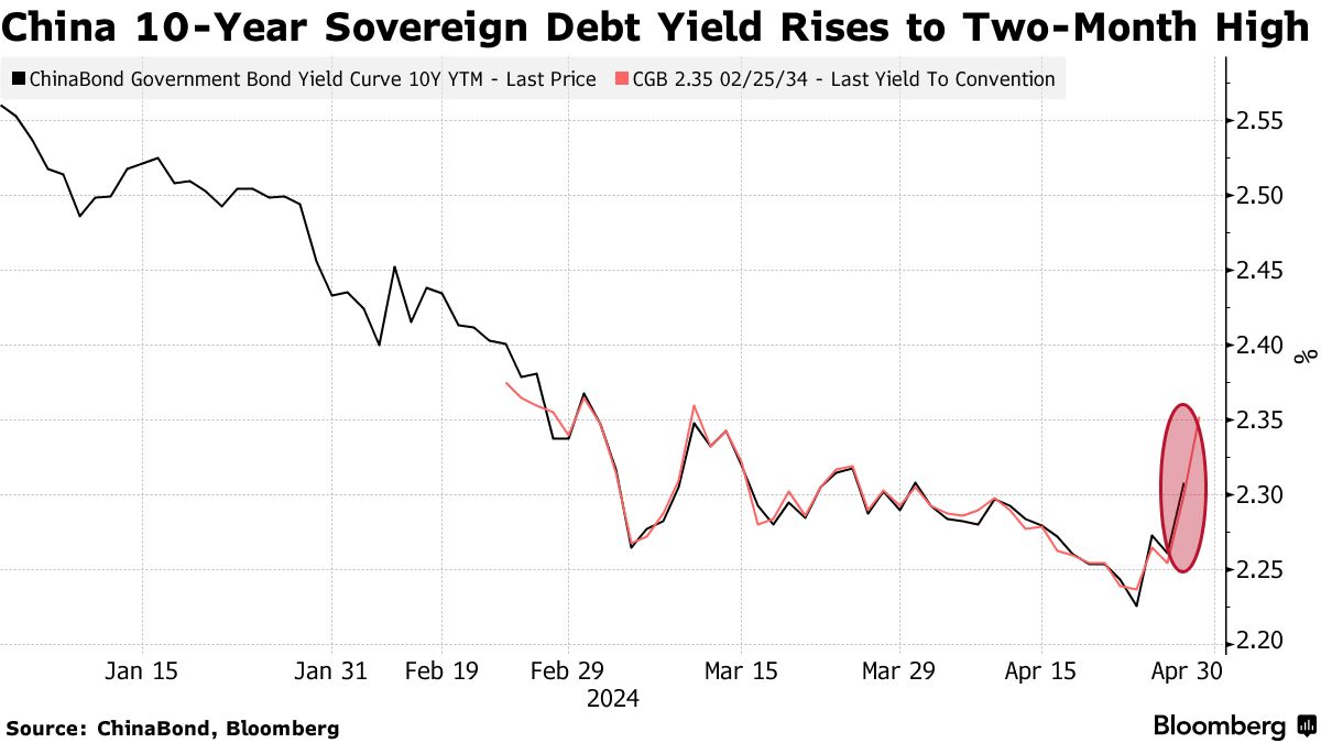 市场对这一信息做出了反应,主权债券出现抛售,投资者也将资金转移到追逐中国股市反弹。中国30年期债券收益率周一上升至2.59%以上,创下两个多月来的最高水平。十年期政府债券收益率在过去三个交易日中上涨了超过10个基点,其中包括周日的交易日。