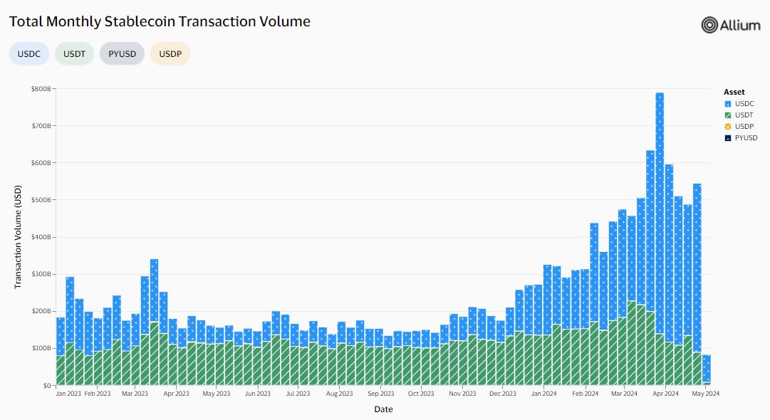 数据显示,自2024年初以来,Circle的USDC市场份额不断增加,上周的交易量达到4560亿美元,而泰达币的USDT为890亿美元。自1月份以来,USDC还占据了总交易量的50%。Visa于2020年与Circle合作,但没有解释是什么促使了USDC使用量的增加。