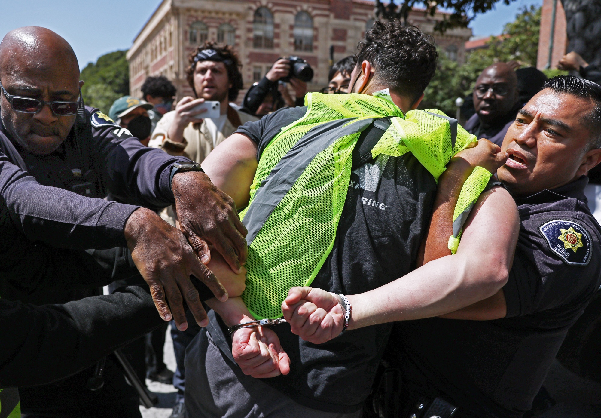 4月24日,南加州大学警察拘留一名亲巴勒斯坦示威者。摄影师:Mario Tama/Getty Images从南加州大学和哥伦比亚大学等精英私立学校到加州、德克萨斯、俄亥俄和密歇根等巨大的公立大学,校园领导人习惯于在这个时候展开庆祝活动,挂上彩旗和气球,整理他们的学术服饰,但现在却在为美国高等教育日益深化的危机制定安全计划。