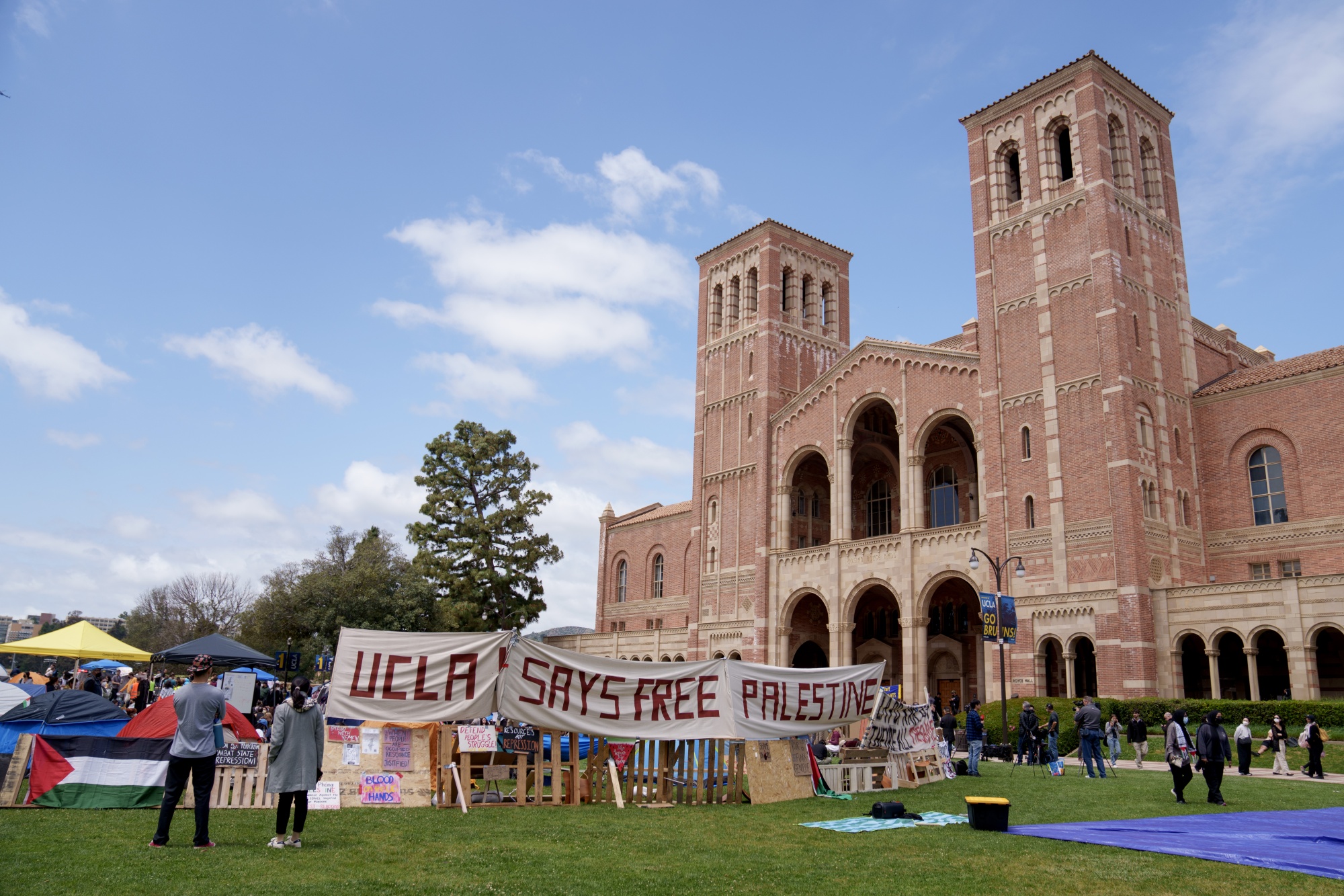 支持巴勒斯坦的示威者于4月25日占领了加州大学洛杉矶分校的一个营地。摄影师:Eric Thayer/Getty Images“领导者们感到在不可调和和相互竞争的价值观之间左右为难,”Barker 在一次采访中说。“这是一个典型的无法取胜的局面。”