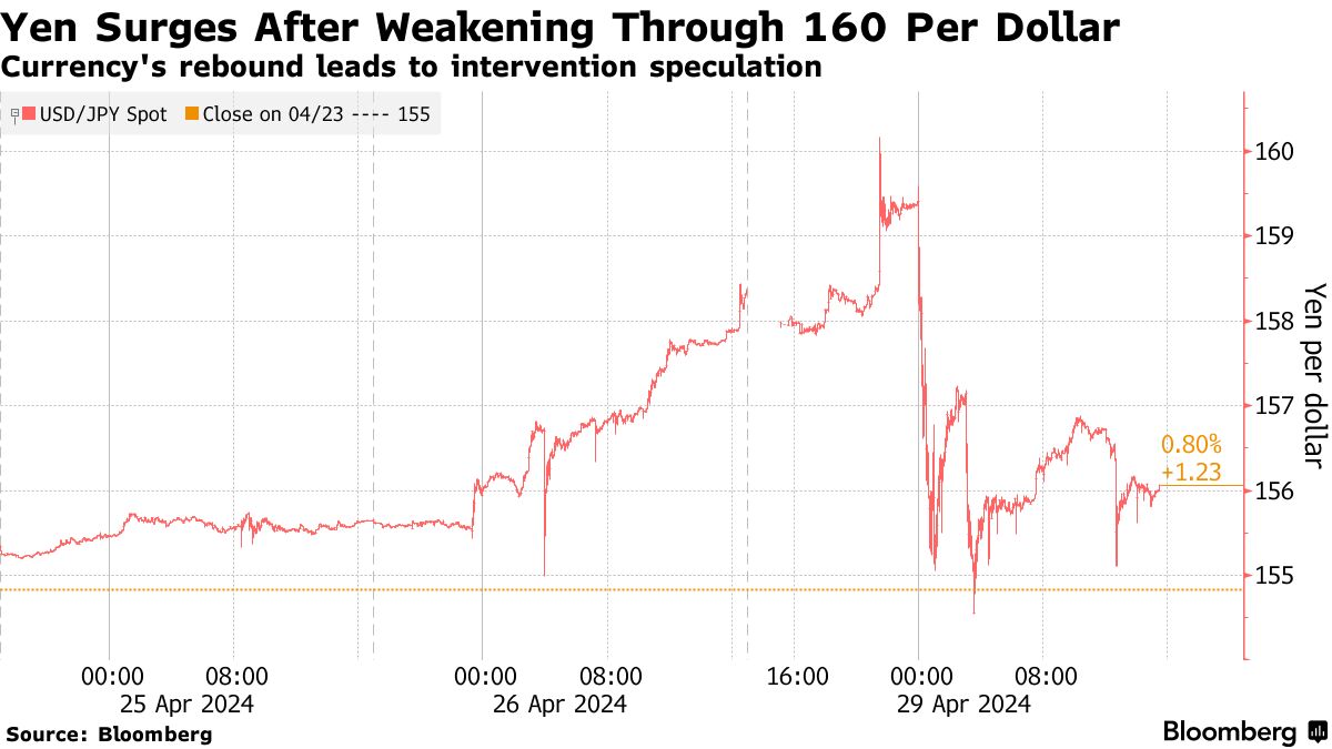 日元兑美元34年来最弱水平后出现了强劲反弹,有传言称日本政府首次自2022年以来干预以支持自己备受困扰的货币。