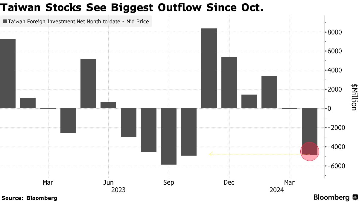 截至周一收盘,海外资金经理已经从当地股票中撤回了49亿美元,彭博编制的数据显示。这将是自去年十月以来最大的净外流。台湾台指数4月份迄今上涨不到1%,而前两个月至少上涨了6%。