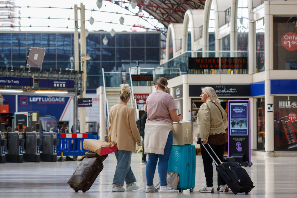 在伦敦维多利亚火车站进行的火车司机罢工期间,乘客们在站厅内行走,日期为2024年4月8日星期一。