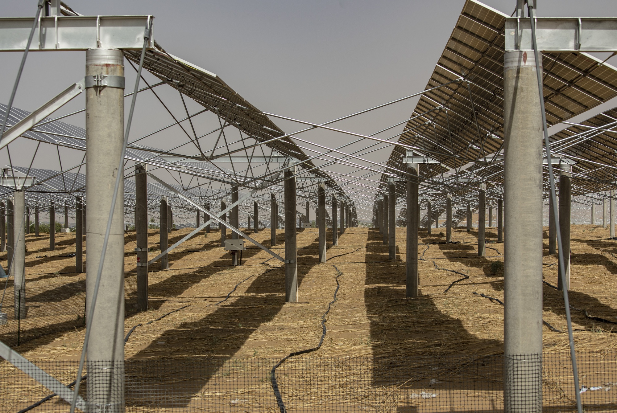 在内蒙古鄂尔多斯库布齐沙漠的一个太阳能项目中的太阳能电池板。