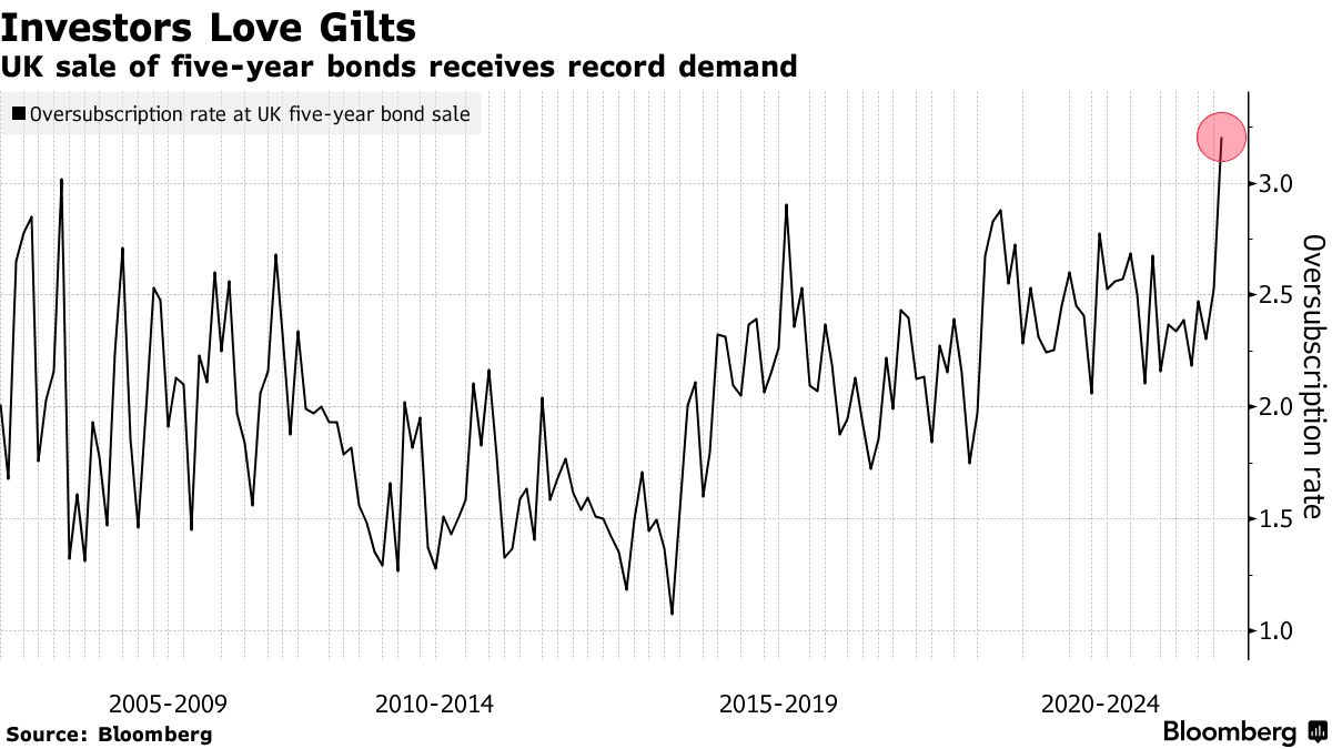 英国五年期债券销售在拍卖会上获得创纪录的需求-彭博社