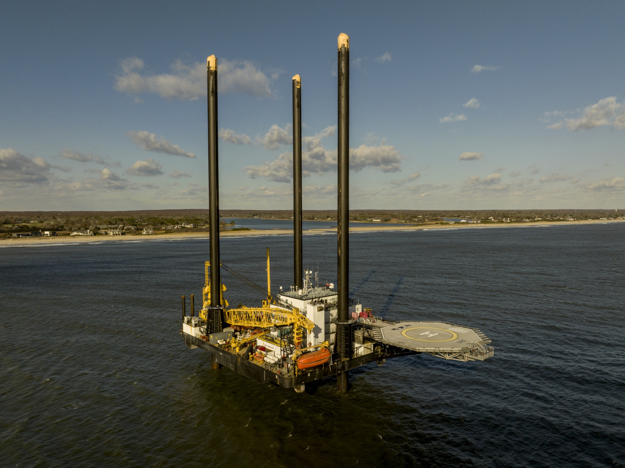 南福克风电项目现场的升降船。摄影师:彭博社最近有两个大型发展项目已经投入运营:葡萄园风电位于马萨诸塞州附近,而南福克风电位于纽约海岸附近几个月前开始向岸上输送电力。