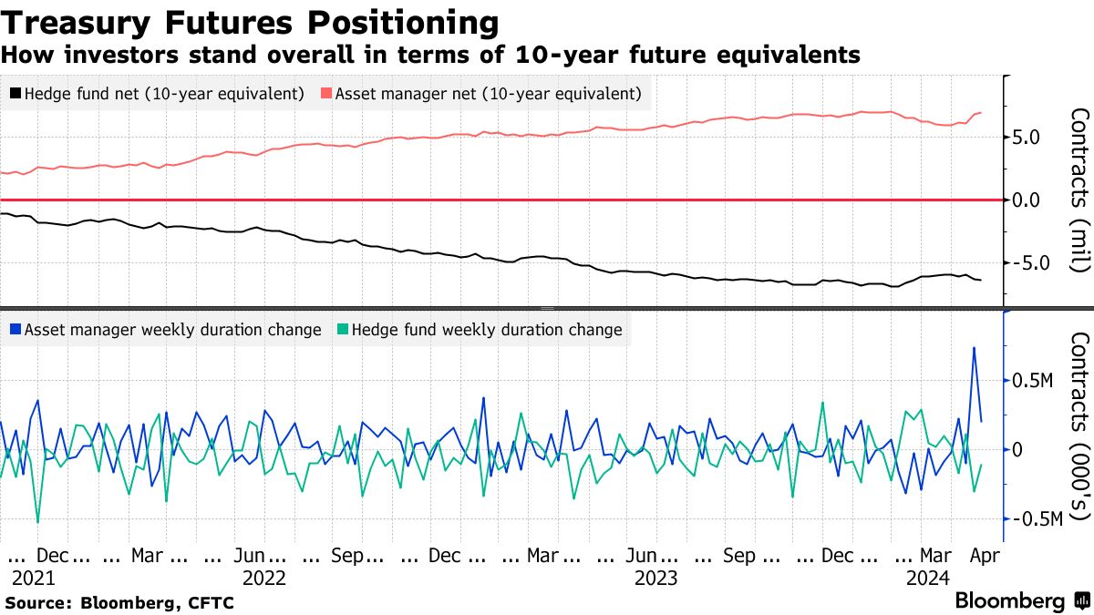 四月份,美国国债表现最差,经济韧性和顽固通胀的迹象日益明显,导致投资者减少对美联储降息的押注,转而加大空头押注。今年初预期2024年将出现多次降息的交易员现在只定价一次完整的四分之一点降息 — 有些人现在质疑中央银行是否会采取任何行动。