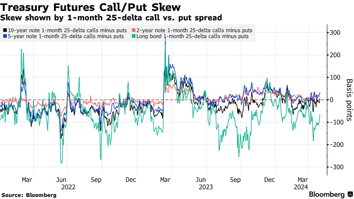 用于对冲长期国债抛售的期权溢价继续下降,尽管与所谓的中短端相比仍然昂贵,中短端的溢价接近中性。最近在国债期权市场中的交易包括看跌期权买家在5年期限上,目标是到5月底收益率上升至4.85%,以及通过10年期6月期权的550万美元做空波动率头寸。