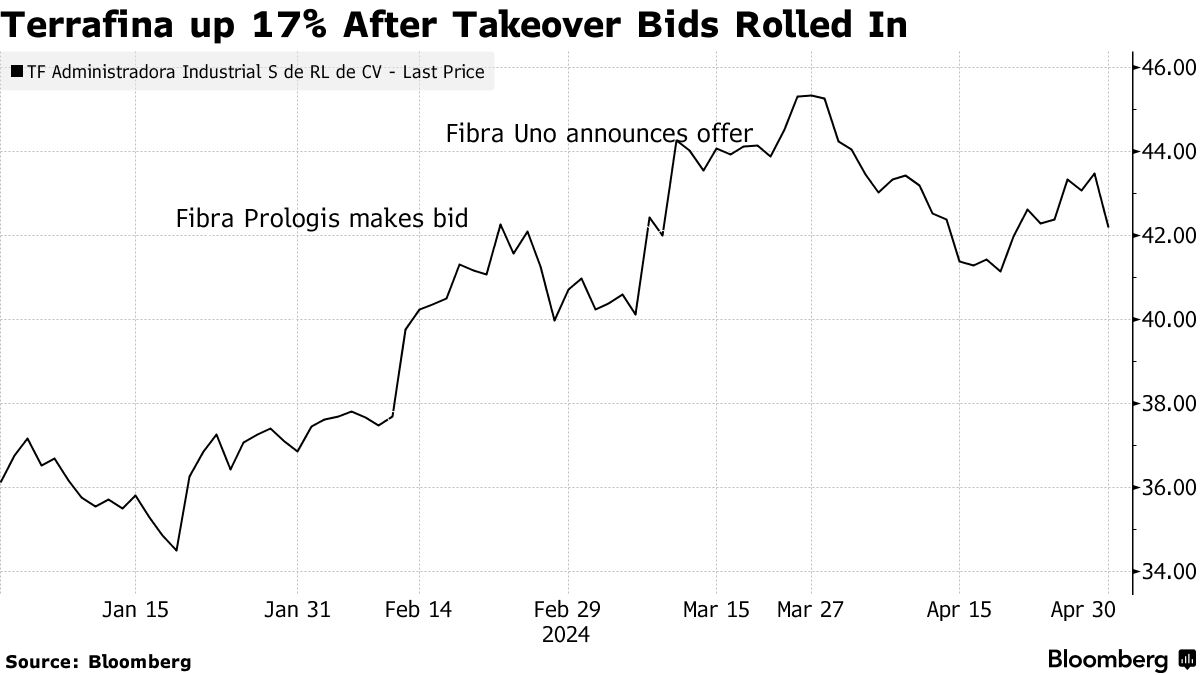 自2月份开始出现收购要约以来,Terrafina的股价今年上涨了17%,使其市值达到19亿美元。首席执行官阿尔贝托·克雷廷表示,墨西哥从未见过如此多针对同一公司的竞争性公开要约。