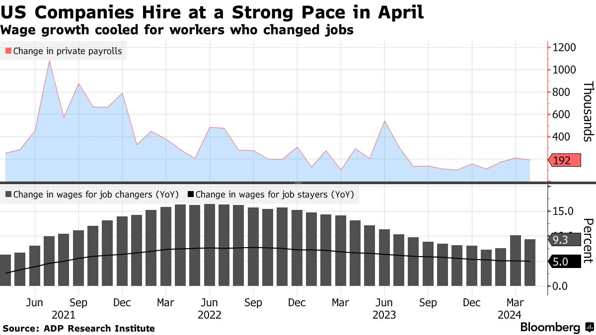 根据ADP研究所发布的数据,4月份美国私营部门的工资增加了192,000人,这是根据之前一个月的数据修订后得出的。迈克尔·麦基在彭博电视台上详细介绍了这些数据。