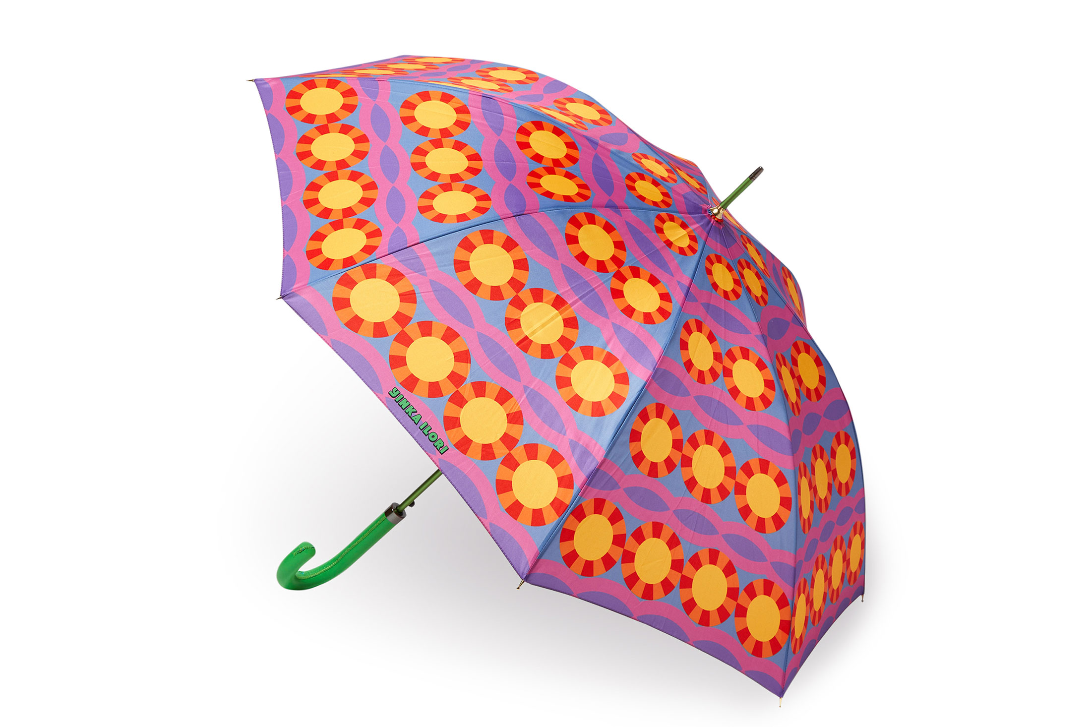 Orun伞。来源:MoMA设计商店阴雨天的亮点用艺术家Yinka Ilori的这把欢快的Orun伞点亮即使最阴沉的日子。它由回收的PET瓶制成,印有数十个彩色太阳,背景是蓝天,每一排之间用俏皮的粉红色和紫色图案分隔开。明亮的绿色,弯曲的皮革包覆手柄将在标准黑色的海洋中脱颖而出。$75