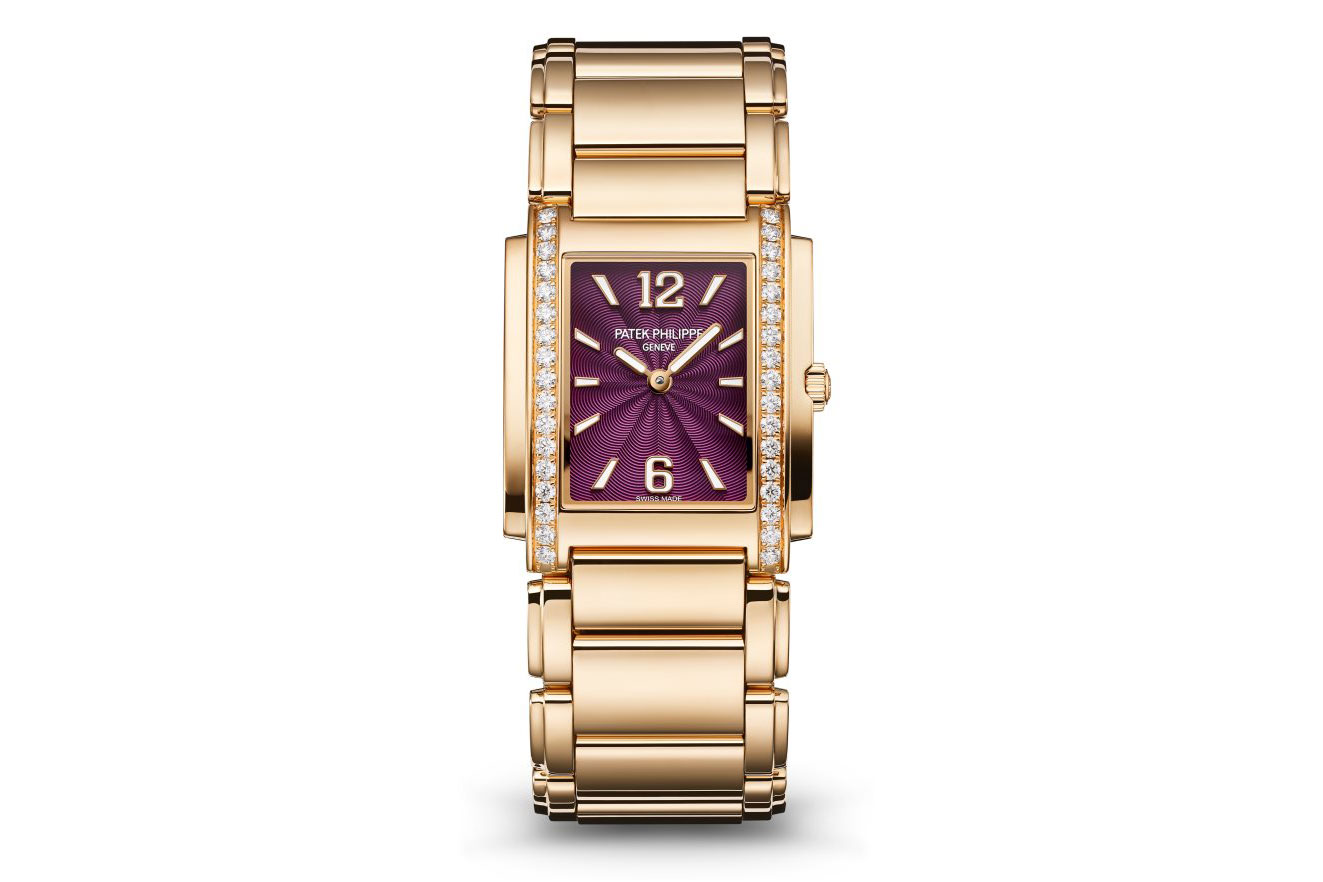 百达翡丽的Twenty~4系列,玫瑰金紫色表盘。来源:百达翡丽迷人的手表作为百达翡丽标志性的女士系列,Twenty~4在今年庆祝其25周年纪念,其最新推出的款式是送给给予你一切的女人的终极礼物。这款手镯式手表拥有华丽的紫色表盘,表盘上有一条迷人的波浪图案,由艺术家们绘制数十层薄薄的紫色,然后添加透明的光泽漆。闪闪发光的表盘两侧点缀着一排闪闪发光的钻石。$47,607