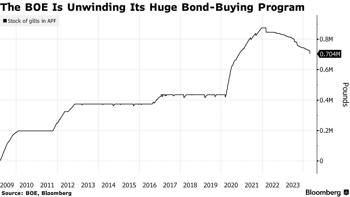 自2022年以来,英国银行已将投资组合缩减至7040亿英镑,并继续取消量化宽松。储备量大致与量化宽松减少的幅度相符。