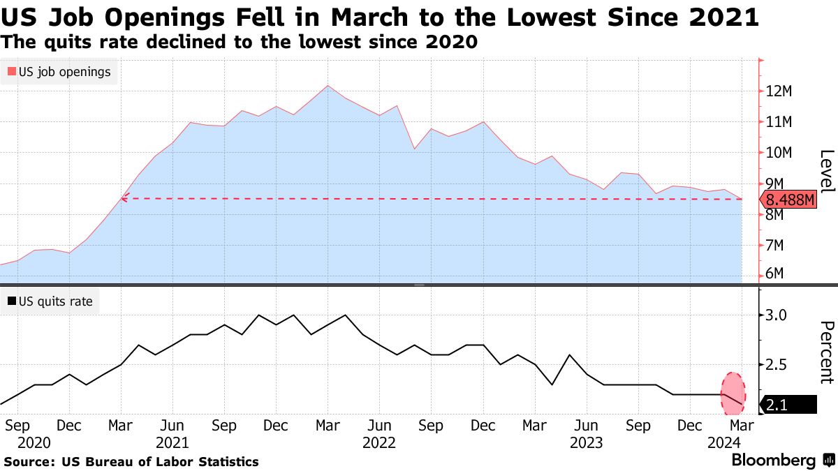 JOLTS 2024年3月:美国职位空缺下降,辞职率进一步放缓 - 彭博社