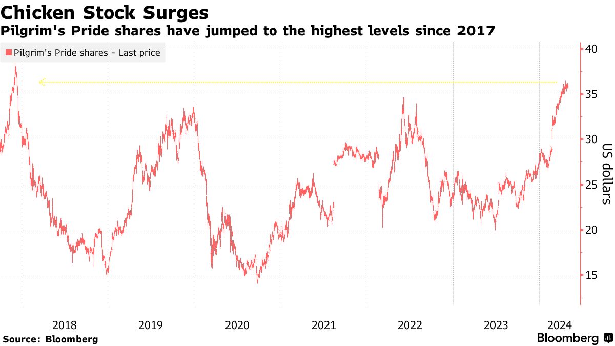 鸡肉生产商最近受益于更便宜的饲料和库存紧张,因为需求有所改善。消费者仍在寻找替代更高牛肉价格的选择,这给了一个行业提振,去年因供应过剩而利润下降。