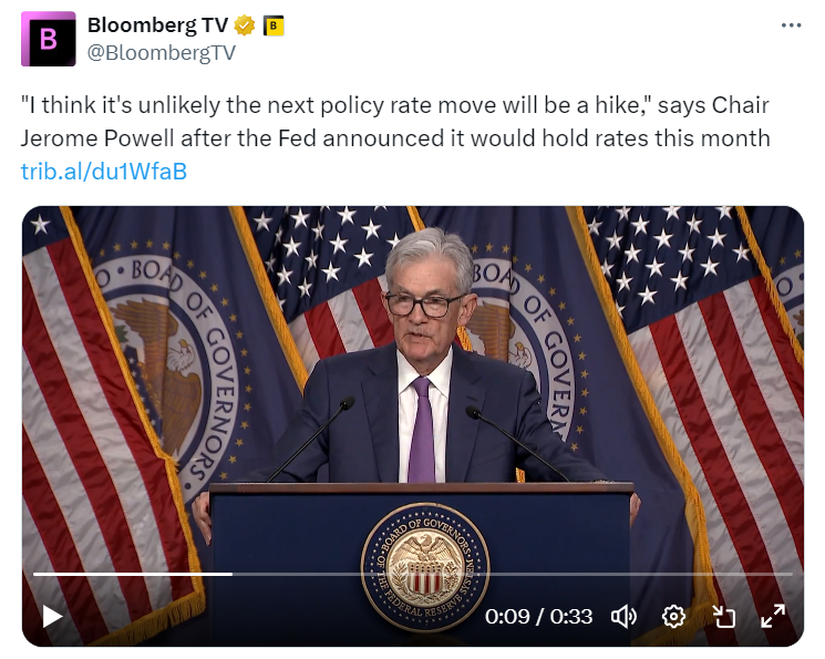对于股票来说,有一种感觉,即联邦储备委员会不会搅乱派对。根据鲍威尔的说法,加息不太可能。政策仍然是限制性的,随着更高政策利率的长期和可变滞后仍在影响经济。这似乎仍然是一个准备在数据配合的情况下立即降息的美联储。(美联储还在减缓其资产负债表的缩减速度。)