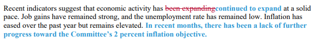 以下是美联储声明中的关键段落与上次会议的对比,删除部分为红色,新材料为粗体和蓝色。