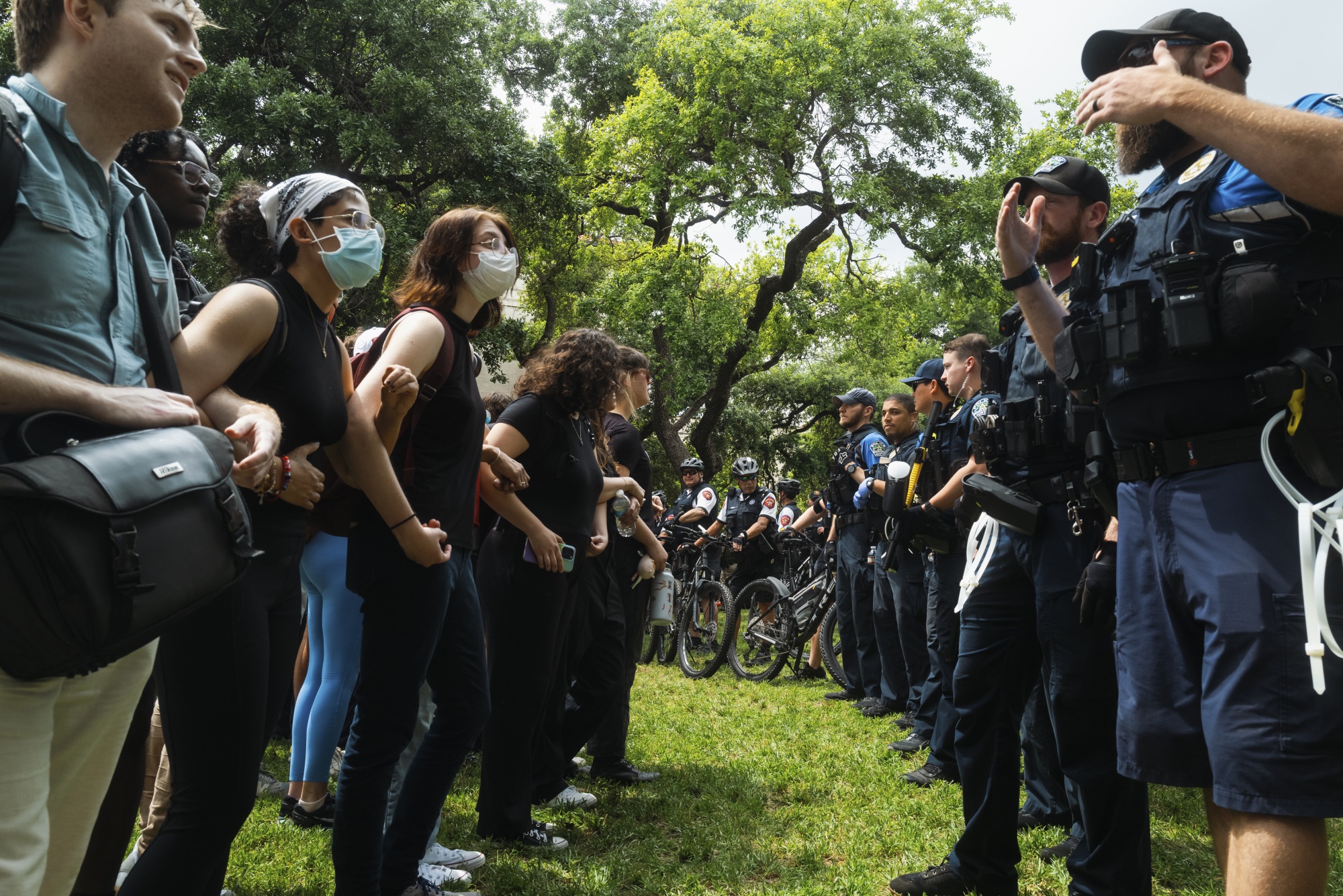 示威者在4月24日在奥斯汀德克萨斯大学(UT)举行的亲巴勒斯坦抗议活动中与警察对峙。摄影师:Jordan Vonderhaar/Bloomberg### 5. 国会扮演什么角色?